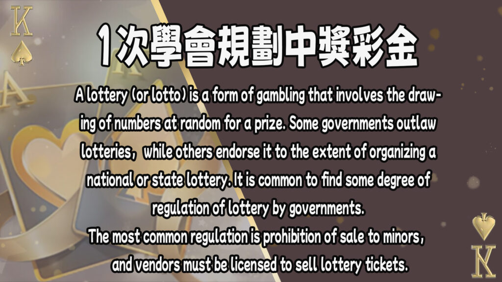 A lottery (or lotto) is a form of gambling that involves the drawing of numbers at random for a prize. Some governments outlaw lotteries, while others endorse it to the extent of organizing a national or state lottery. It is common to find some degree of regulation of lottery by governments. The most common regulation is prohibition of sale to minors, and vendors must be licensed to sell lottery tickets.