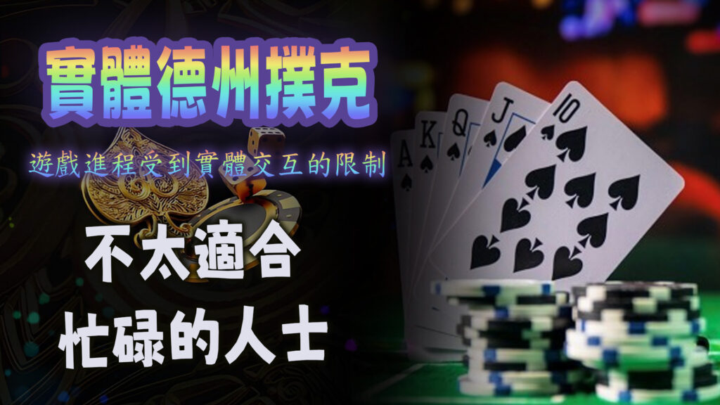 • 固定時間和地點:您必須按照預定的時間和地點參加實體桌面德州撲克遊戲,這可能不太適合忙碌的人士。