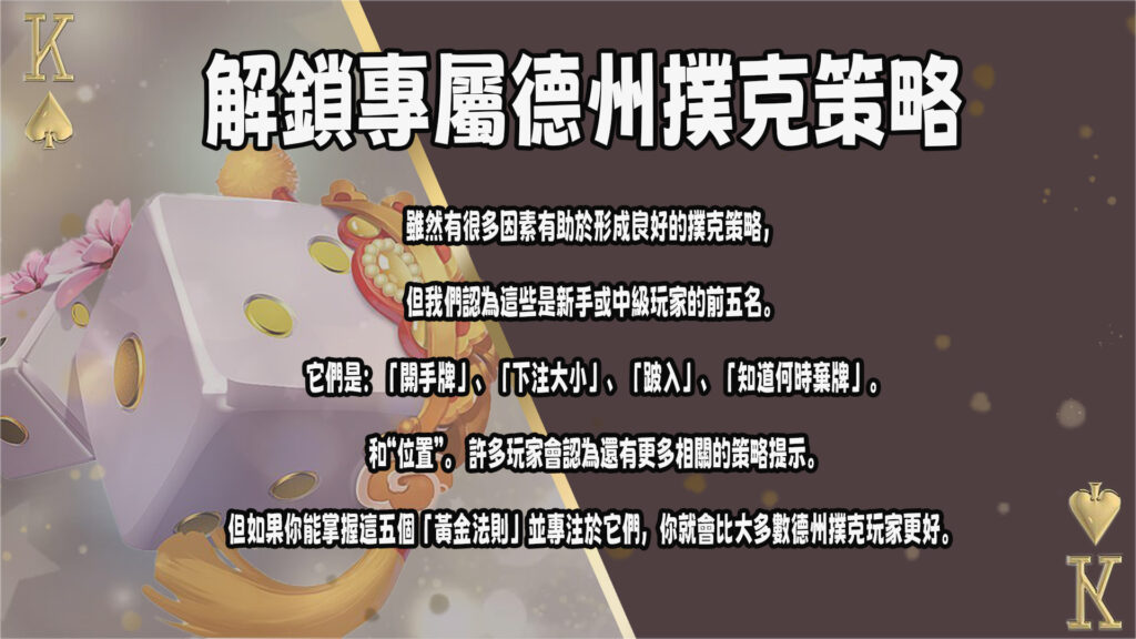 While there are many things that add up to good poker strategy, we feel that these are the Top Five for new or intermediate players. They are: “Opening Hands”, “Bet Sizing”, “Limping”, “Knowing When to Fold” and “Position”. Many players would argue that there are more relevant strategy tips. However, if you can master these five “Golden Rules”, and focus on them, you will be better than most Texas Hold’em players. (資料來源)