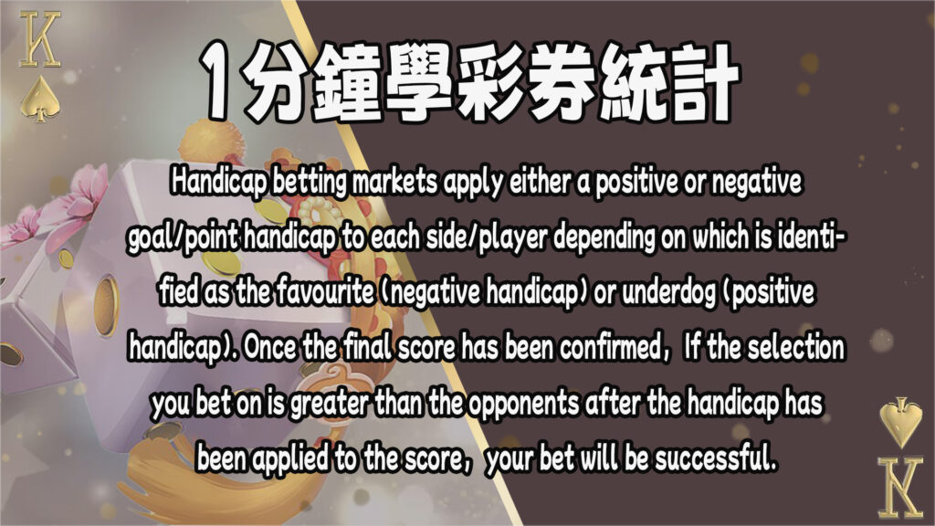 Handicap betting markets apply either a positive or negative goal/point handicap to each side/player depending on which is identified as the favourite (negative handicap) or underdog (positive handicap). Once the final score has been confirmed, If the selection you bet on is greater than the opponents after the handicap has been applied to the score, your bet will be successful.(資料來源)