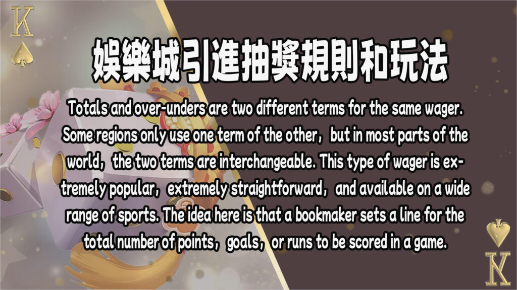 Totals and over-unders are two different terms for the same wager. Some regions only use one term of the other, but in most parts of the world, the two terms are interchangeable. This type of wager is extremely popular, extremely straightforward, and available on a wide range of sports. The idea here is that a bookmaker sets a line for the total number of points, goals, or runs to be scored in a game. They then give you the option of betting on whether the actual total will be higher or lower than the line they’ve set. Betting on higher is referred to as backing the over, while betting on lower is referred to as backing the under. (資料來源)